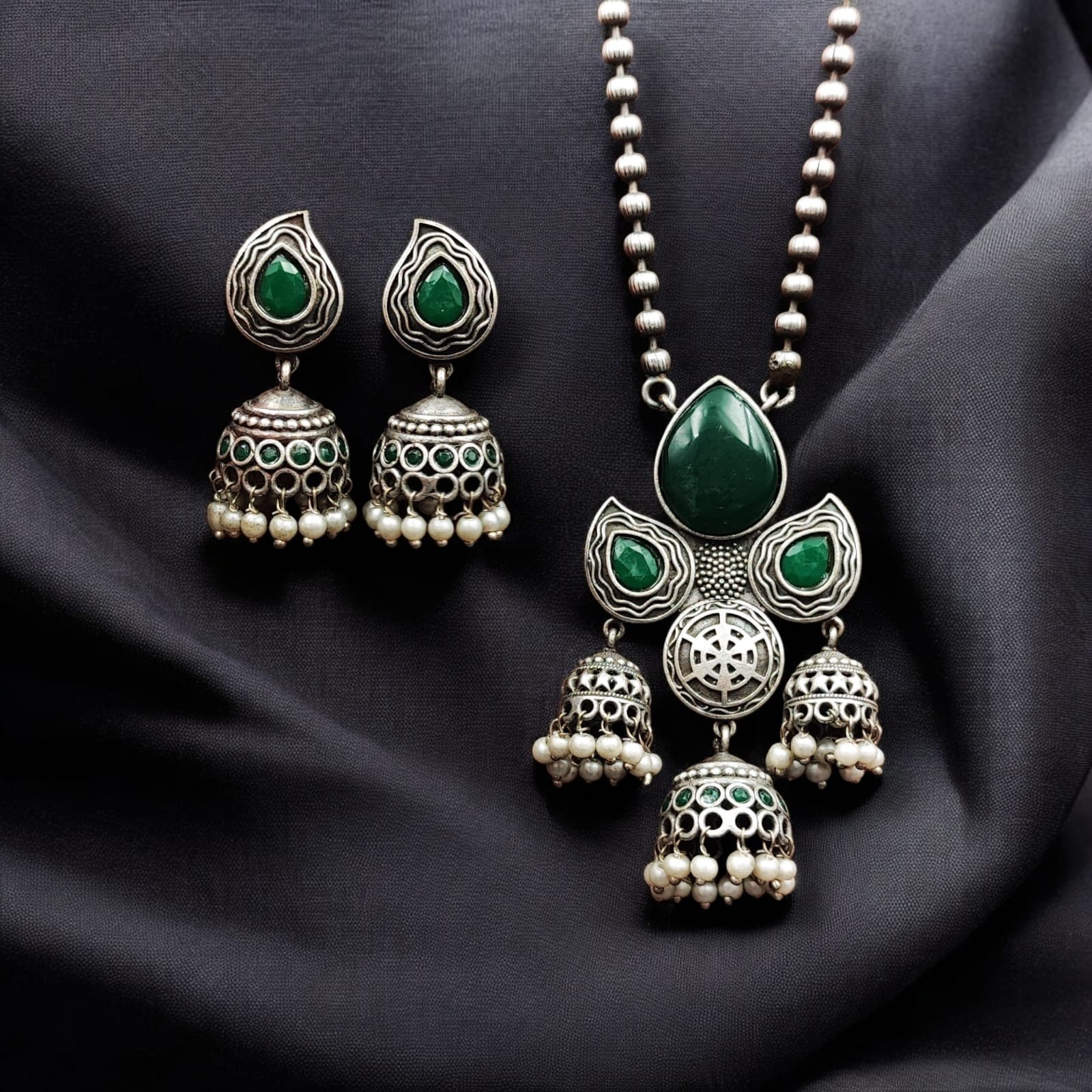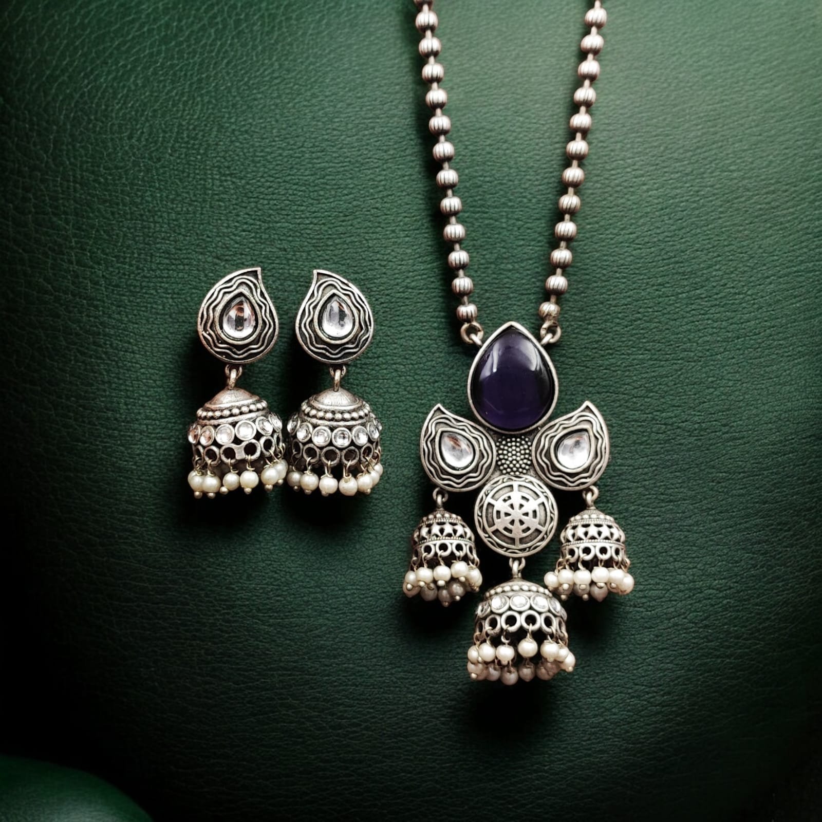 DExquisite Silver Look-Alike Jhumka Necklace Set | Vintage Oxidized Jewelry for Women