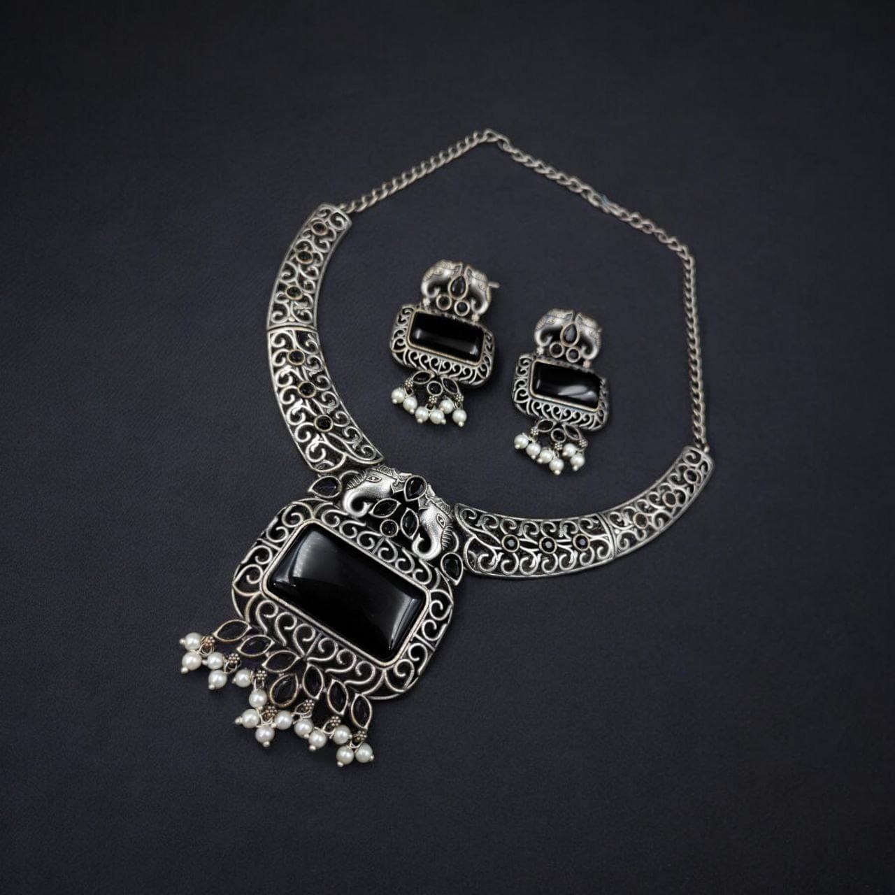 Traditional Silver Replica Nandi Necklace Set with Monalisa Stone & Pearl Accents | My Fashion – My Style My Way