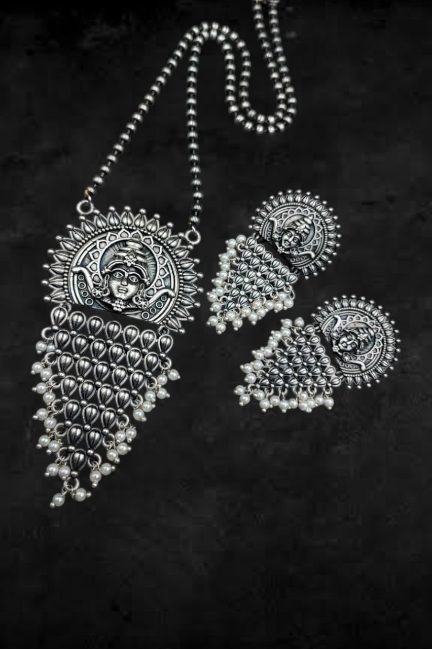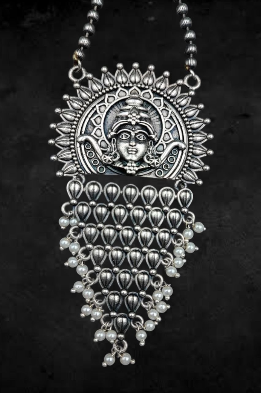 Unleash divine energy with this handcrafted Durga Pendant Set in oxidised silver. Ideal for Navratri, Durga Puja, and festive occasions.