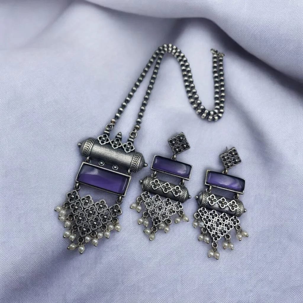 Shop handcrafted silver replica pendant sets with oxidized Monalisa stone. Lightweight, elegant, perfect for weddings & festive gifting. Free shipping on My Fashion India.